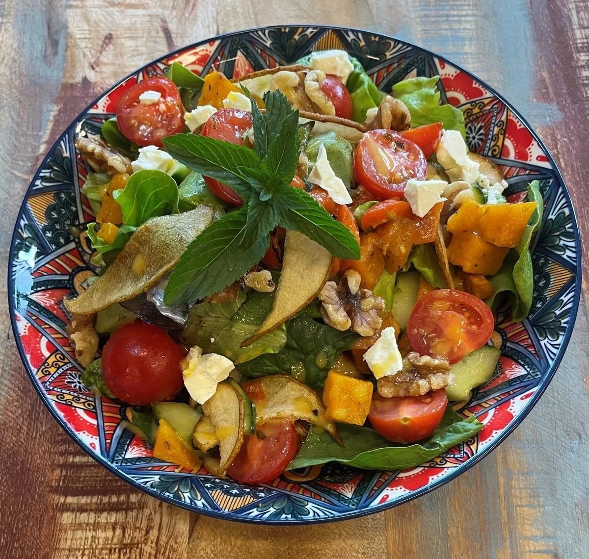 Enjoy a Warm Pumpkin Salad, served with roasted peppers, cherry tomatoes, candied pear, walnuts and fetta, then finished with an apricot vinaigrette.