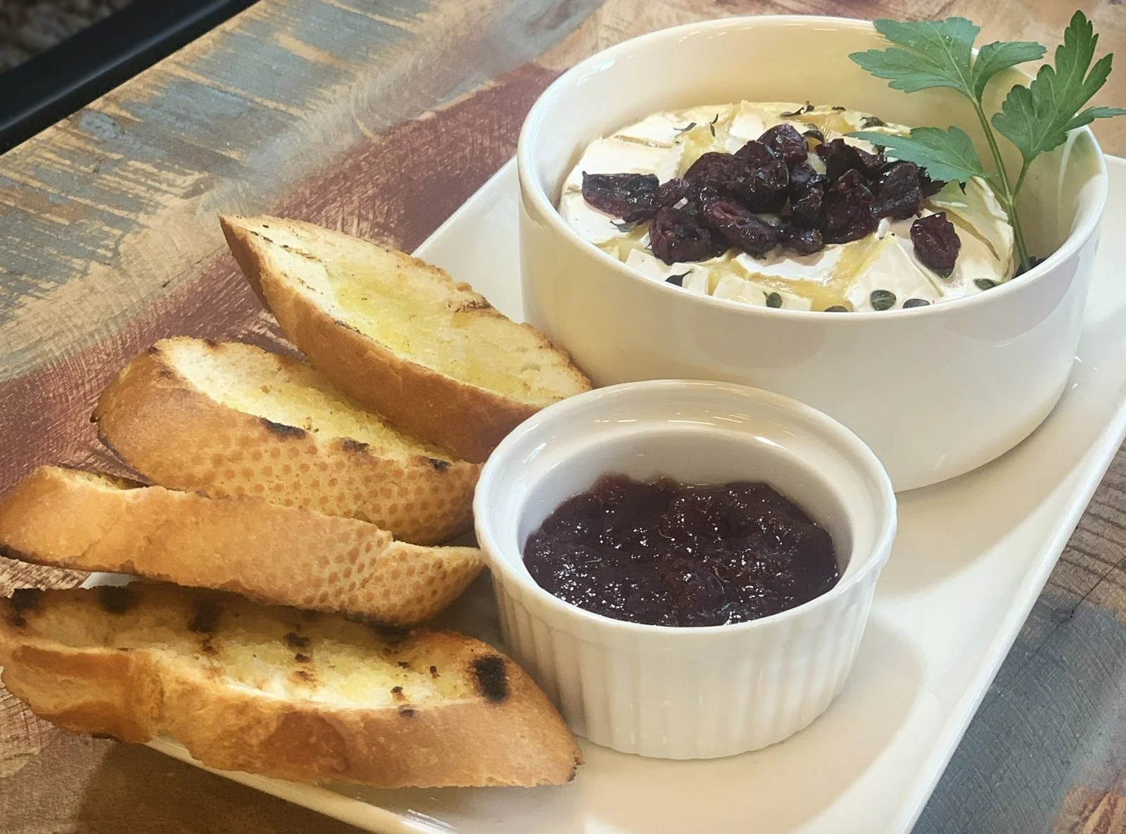 More Tapas style is our Oven Baked Camembert accompanied by fresh thyme, cranberries and honey. Served with crusty bread and orange and cranberry sauce.